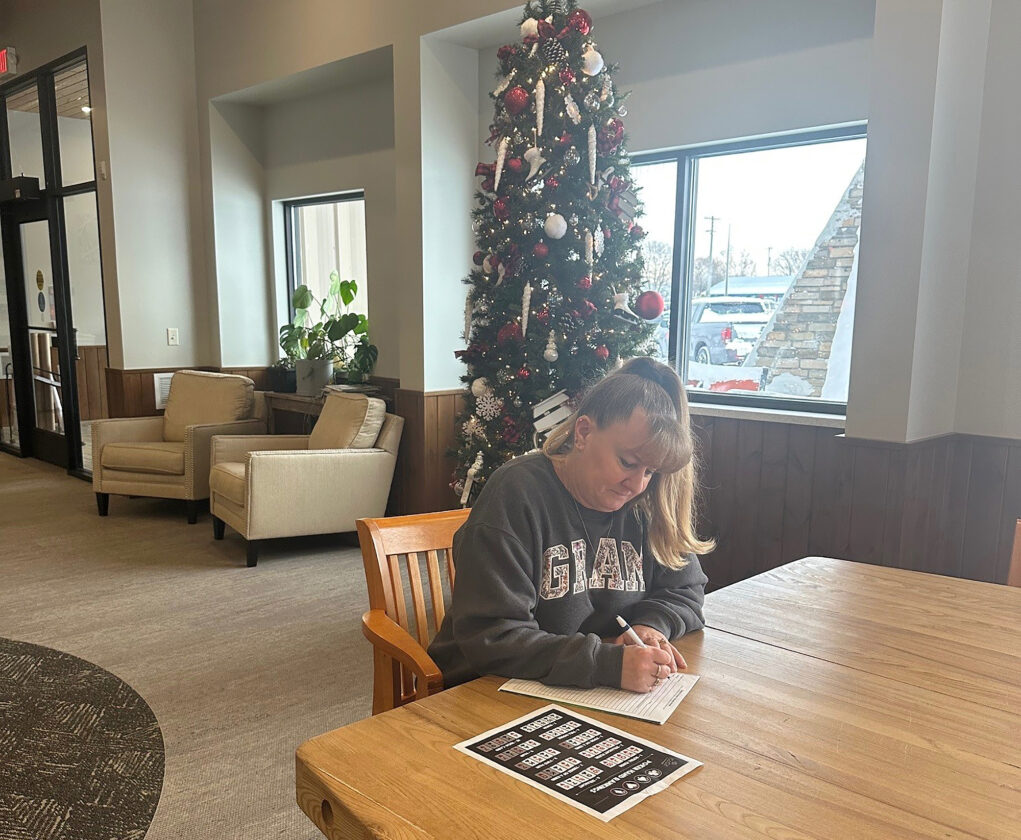 Sleigh the Deals participant Joanne Chouinard fills out a receipt verification form to confirm the number of poker cards earned for a chance to win $1,000. (Contributed photo)