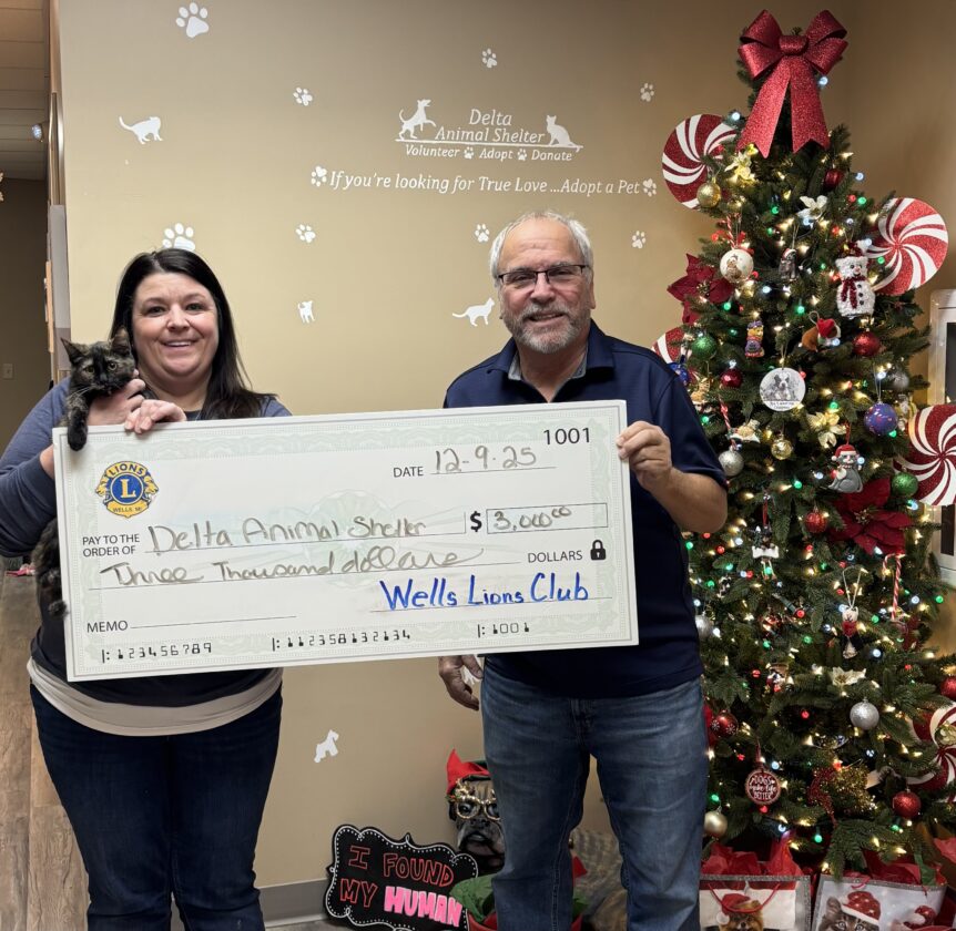 Wells Lions Club treasurer Tom Skradski presents a $3,000 check to Tonya Gartland, executive director of the Delta Animal Shelter in Escanaba. The donation stems from the Lions Club 2025 deerslayer meeting in December. In recent months, the Wells Lions Club has donated more than $10,000 to the St. Vincent De Paul food pantries in Escanaba and Gladstone, Salvation Army food pantry, the Community Thanksgiving dinner, Shop with a Cop, Eskymo Blue Line Club and Tri-County Safe Harbor in Escanaba.