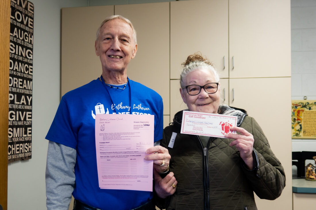 - Bethany Lutheran Church’s Free Store in Escanaba provides household goods to community members in need. Rodney Spence, the church’s property manager and custodian, left, stands with Patti Palzewicz, the church’s 1,000th customer, who received a surprise gift certificate to Elmer’s County Market. (Courtesy photo)