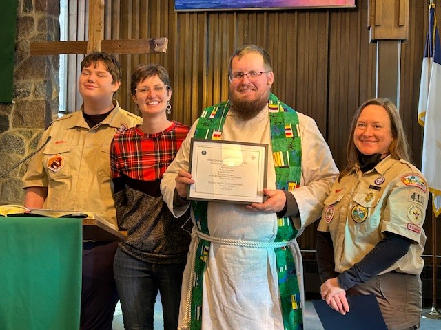 The award was presented at Immanuel Lutheran Church prior to its annual Scout Sunday service. Immanuel sponsors Troop 411, which is part of the Michigan Crossroads Council 780. Two years ago, the Scouting Hiawathaland District named the church its supporting organization of the year.