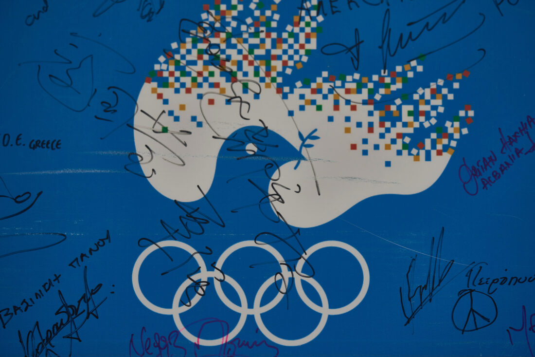 A board bearing signatures of athletes, leaders and public figures, in support of the Olympic Truce is displayed inside the Athens Olympic Museum on Jan. 28, 2026. (AP Photo/Petros Giannakouris)