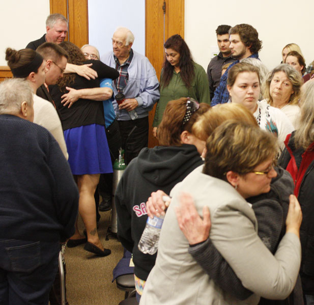 Jenny Lancour | Daily Press Jolene Eichhorn’s family and friends console each other following Gregory Ihander being declared guilty of second-degree murder in Menominee County Circuit Court Thursday. Ihander will be sentenced in circuit court on April 13.