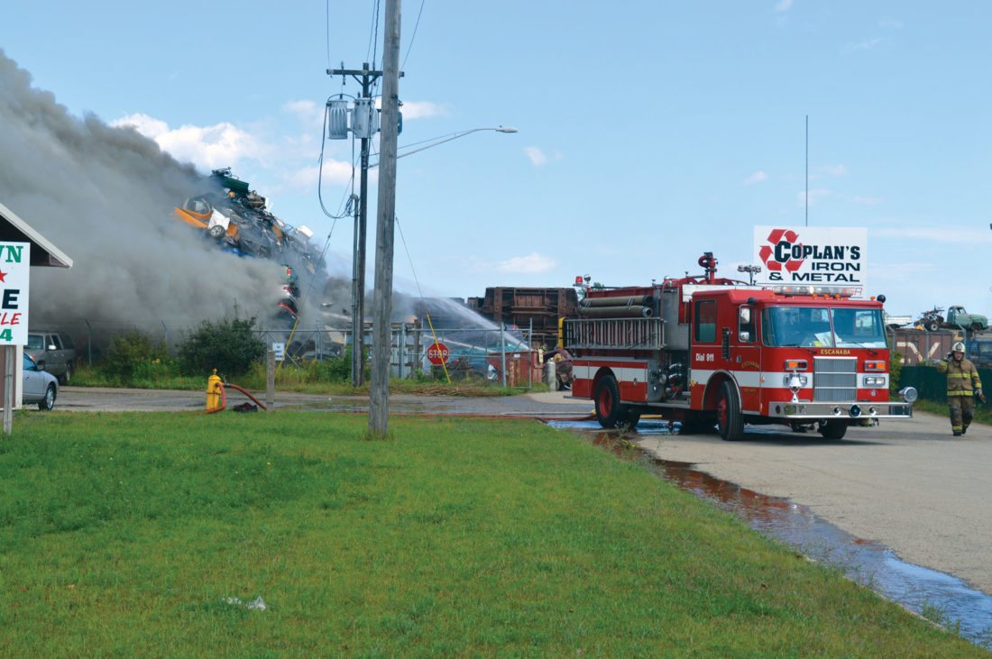 During the blaze, Coplan’s staff used heavy machinery to move piles of scrap to assist in extinguishing the fire, said Escanaba Public Safety Director Rob LaMarche. The Delta County Sheriff’s Department blocked off the road by the salvage yard and directed traffic around the scene during the fire.