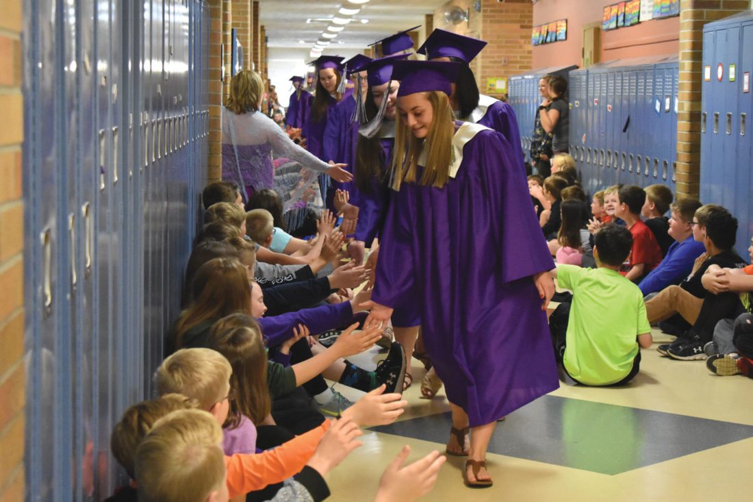Graduating Gladstone High School seniors — dressed in their caps and gowns — get high-fives from Jones Elementary School students during a celebration held for the soon-to-be graduates Tuesday at the school in Gladstone. Gladstone High School’s commencement ceremony will be held Saturday at 1 p.m.