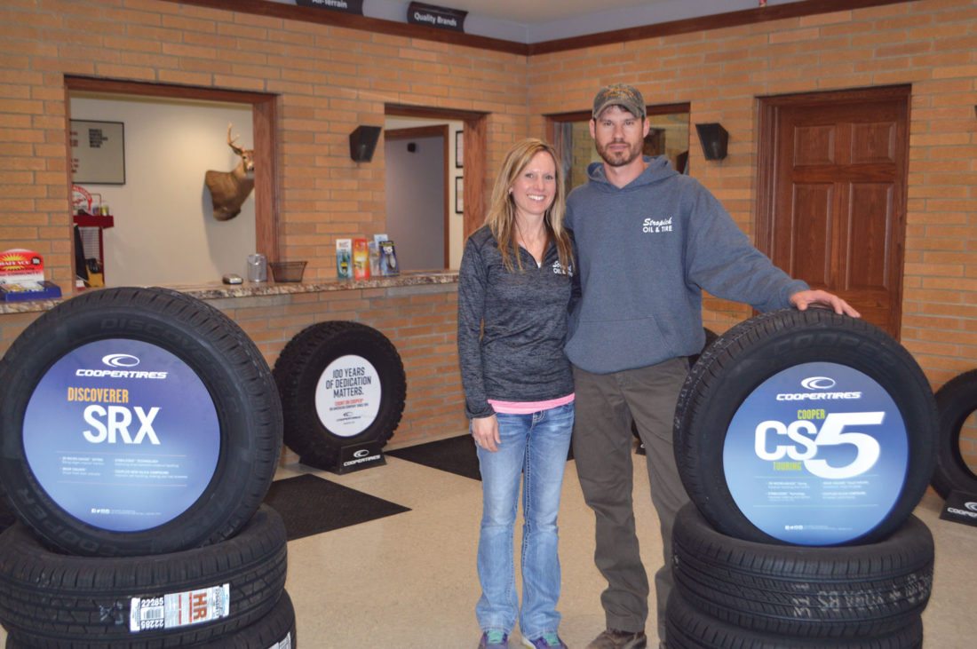 Jordan Beck | Daily Press Stropich Oil and Tire Manager Marty Bartoszek, right, and Bookkeeper Shannon Bartoszek stand in the business’ new storefront. The storefront was completed last summer.