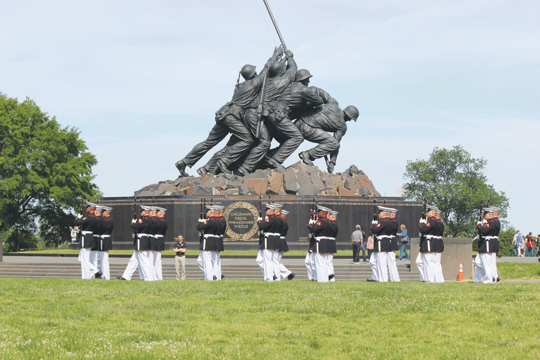 Dennis Grall photo Members of the United States Marine Corps silent drill team perform in front of the iconic Iwo Jima statue in Arlington, Va. Wednesday. It was the final stop for Upper Peninsula Honor Flight Mission 16.