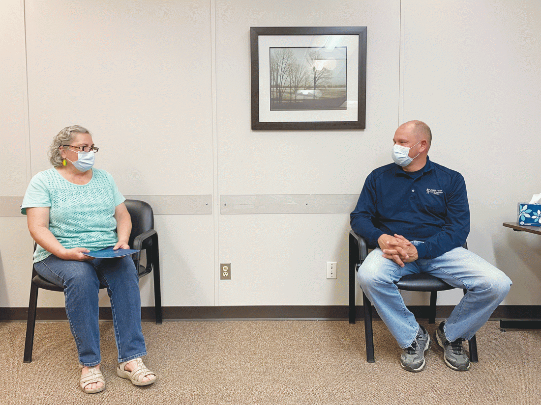 Jordan Beck | Daily Press Public Health, Delta and Menominee Counties Health Officer Michael Snyder, right, and Clerical Supervisor Nancy Wahl follow social distancing guidelines while having a conversation in the lobby of Public Health’s Escanaba office Friday.