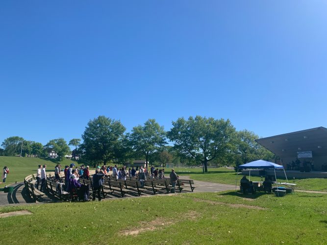 In the interest of safety, sanitization stations and masks are available at Wellspring’s outdoor services. Social distancing guidelines are also being observed.