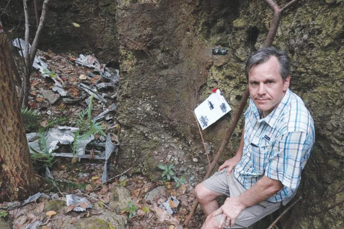 Courtesy photo U.S. Ambassador to Fiji, Kiribati, Nauru, Tonga and Tuvalu Joseph Cella stands by wreckage of the United States B-25G-5 Coral Princess on the island of Nauru in January.