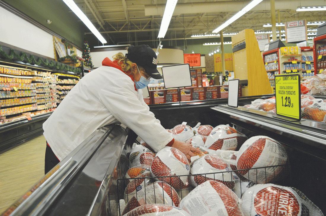 Ilsa Minor | Daily Press Elmer’s County Market employee Mary Mathieson stocks turkeys Friday afternoon. According to a recent American Farm Bureau Federation survey, consumers could see the lowest average cost for a Thanksgiving dinner since 2010.