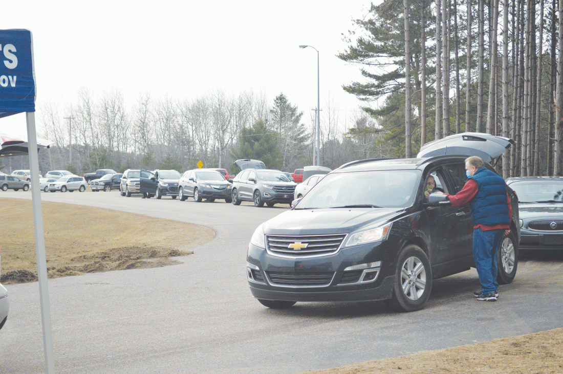 Cars lined up down the street for the distribution, which was a joint effort between the Community Foundation for Delta County and the Escanaba Vet Center and was supported by a number of local businesses. As each car rolled up to be loaded with food, the veterans were thanked for their service.