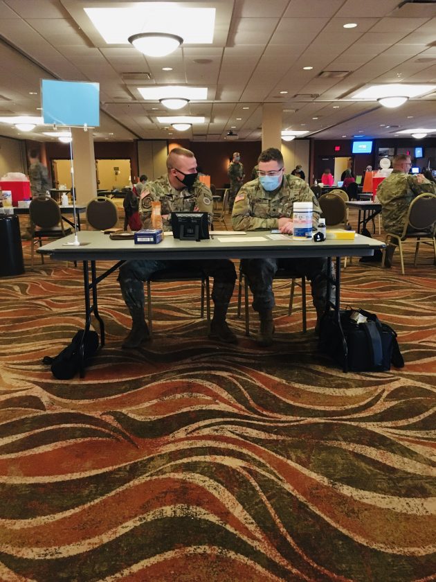 Photo by Aaron Rosendahl Members of the Michigan National Guard staff a COVID-19 vaccination booster clinic earlier this month at the Island Resort and Casino Convention Center in Harris. The clinic was organized by Public Health Delta and Menominee Counities.