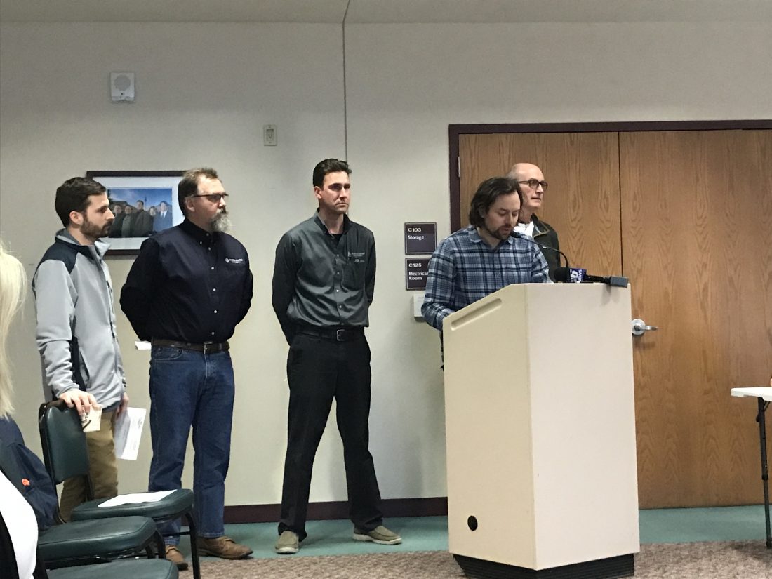 lsa Minor | Daily Press Local developers interested in jointly developing the sites of the former Delta County Jail and Commerce Center buildings through three separate projects spoke together at the March 17 Escanaba City Council meeting. Shown above are, from left, Rick Elrod, Aaron Kadish, Nick Kobasic, Jared Drown, and Matt Sviland.