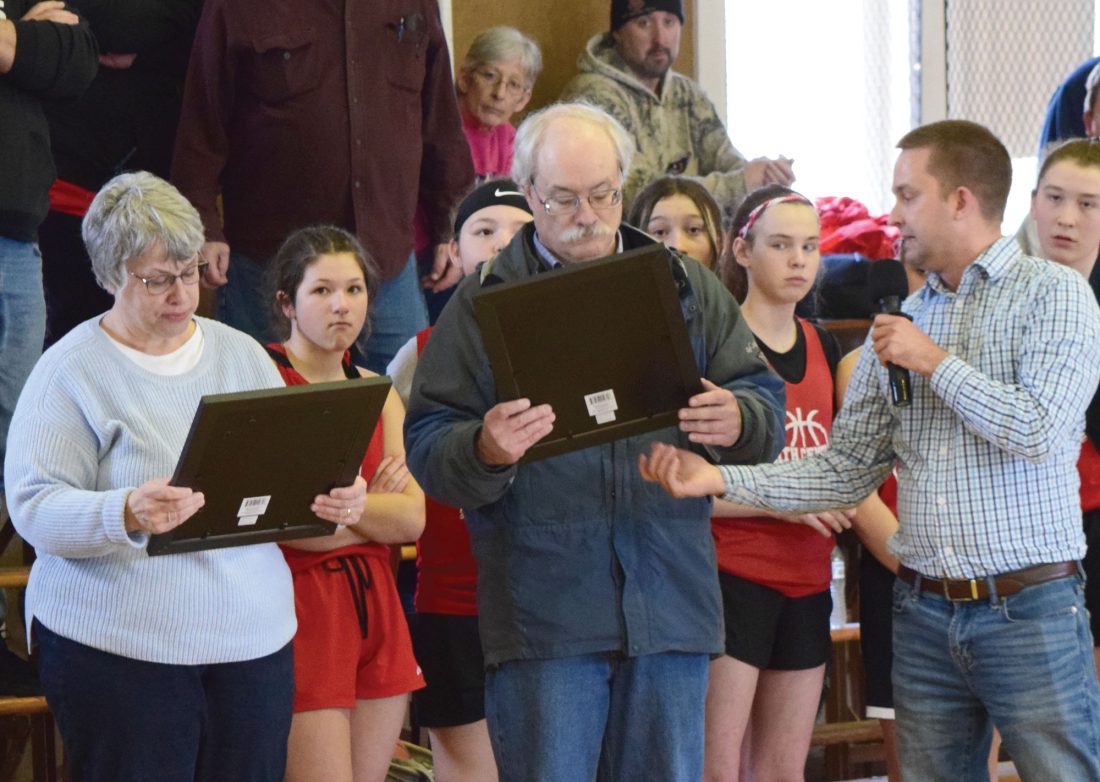 Meyer Township Clerk Chad D. Knodi led a dedication ceremony recently honoring the late Frank Rodman of Hermansville for his work in support of Hermansville as well as the Gold Medal Basketball tournament. The community center where the tournament takes place is now named after Rodman. Knodi also presented Rodman’s daughter, Mary Walkenhorst, and son John Rodman with a copy of the resolution the Meyer Township Board passed honoring Rodman, who died in June at age 94. An Army veteran, Frank Rodman served 25 years as Hermansville postmaster and was active in numerous community organizations. He was inducted into the Upper Peninsula Sports Hall of Fame in 1982.