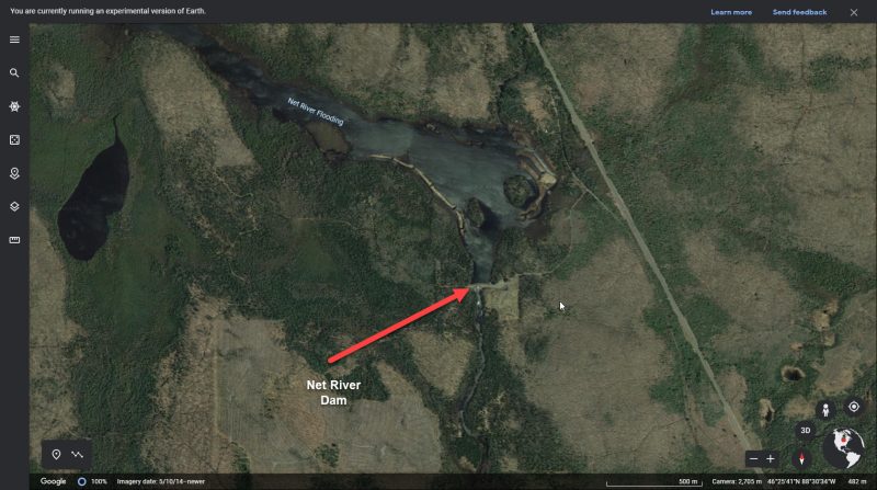 Above, the location of the failed dam can be seen. “Net River Flooding” (as labeled in the northern portion of the map) refers to the impoundment of water intentionally created by the Net River dam. Net River Flooding is the name of the area.