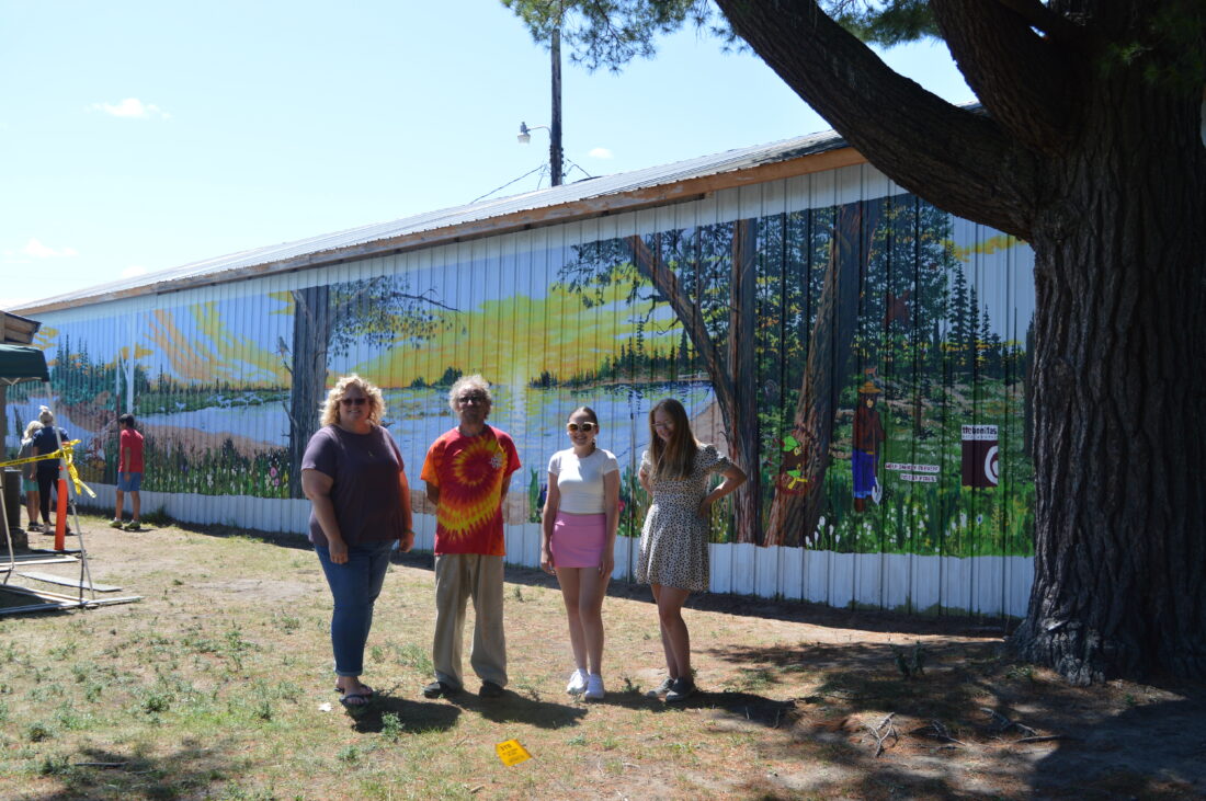Andie Balenger | Daily Press From left to right, Staci Berg, education coordinator at the Bonifas Art Center, James Finlan, professional muralist, Leia Economopoulos, student, and Trinity Pepin, student, pose in front of the new Bonifas and DNR Pocket Park Mural Wednesday afternoon. Finlan, with great assistance from Economopoulos, Pepin, and nine other local students, spent a month and a half painting the mural. The mural is now on full display at the Pocket Park, and can be viewed Monday through Friday from 8 a.m. to 5 p.m.