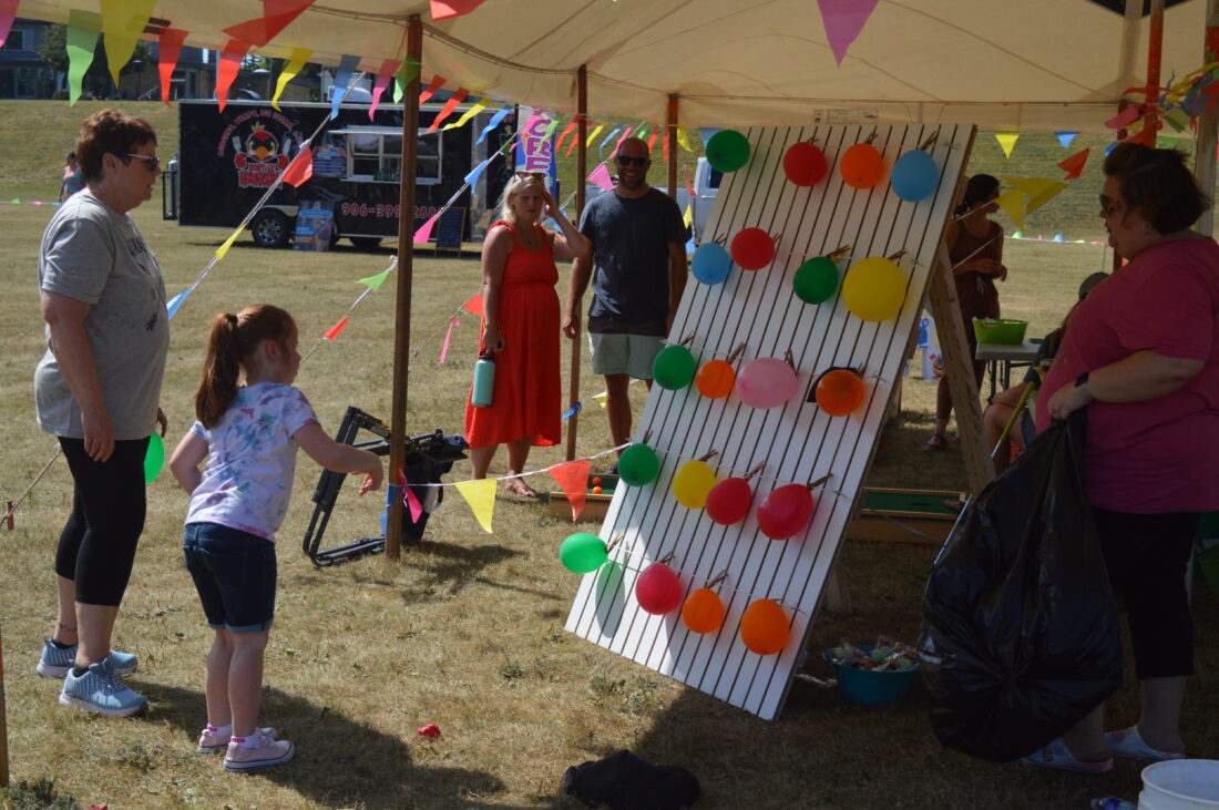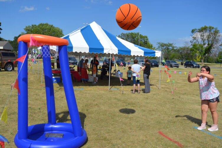 Above, area children try their best to pop a balloon using a bean bag during last night’s “Music Monday Family Fun Day” event at Ludington Park. At right, a young girl shoots and scores on an inflatable basketball hoop during last the event. With one shot attempt per turn, her winning effort was rewarded with a small prize. Other activities included bean bag tic-tac-toe, slip n’ slide bowling, and a miniature obstacle course.