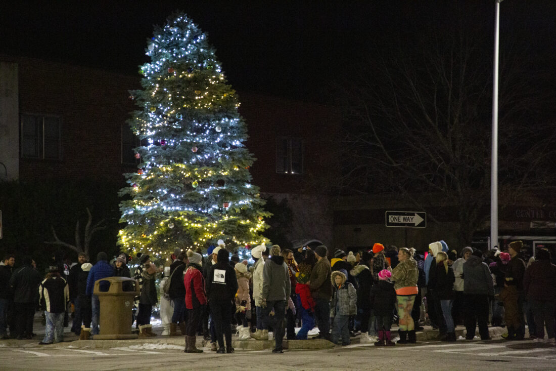 A crowd of people gather around Escanaba’s Christmas tree shortly after it was lit Tuesday night. The tree lighting capped off a night of holiday shopping downtown as the businesses celebrated the kick-off of the season with the annual Black Friday on Tuesday sales promotion.