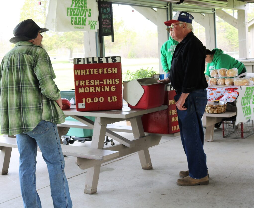 Debrann Holmes photo Rick Bricker chats with Jerry Sitkosky (“the Fish Guy”) at the Rapid River Farmers’ Market. Farmers markets are also open in Escanaba, Gladstone and Manistique.