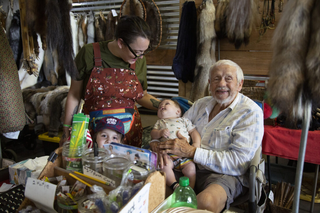 Hannibal Haase, right, of New Prague, Minn., sits at his booth Thursday with his daughter Allie Fisher and his grandchildren Rose, who is nearly 4 and could just see over the table, and six-month-old Rain. Hasse has attended every National Trappers Convention since 1969. The event will continue through Saturday at the Upper Peninsula State Fairgrounds, with gates open each day from 8 a.m. to 5 p.m.