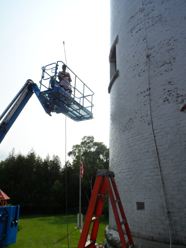 With the assistance of a rental, Genie 65 foot high lift, the tower was twice pressure washed and bleached. Once that was dried the men tuck pointed the brick over the entire structure. Next, they will apply two coats of a specially designed exterior white paint.