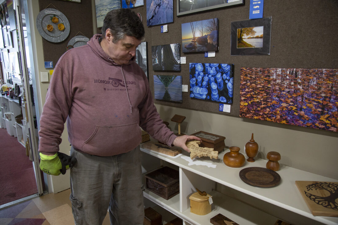 Ilsa Minor | Daily Press Craig Woerpel, owner of 1007 Ludington Street, moves a U.P.-themed cribbage board to reveal the outline of the peninsula stained into a shelf at the East Ludington Gallery by smoke from last week’s fire at the neighboring Schwalbach Kitchens and Trinkets & Treasures. The gallery co-op had renters insurance, but the coverage does not extend to the art damaged in the building.