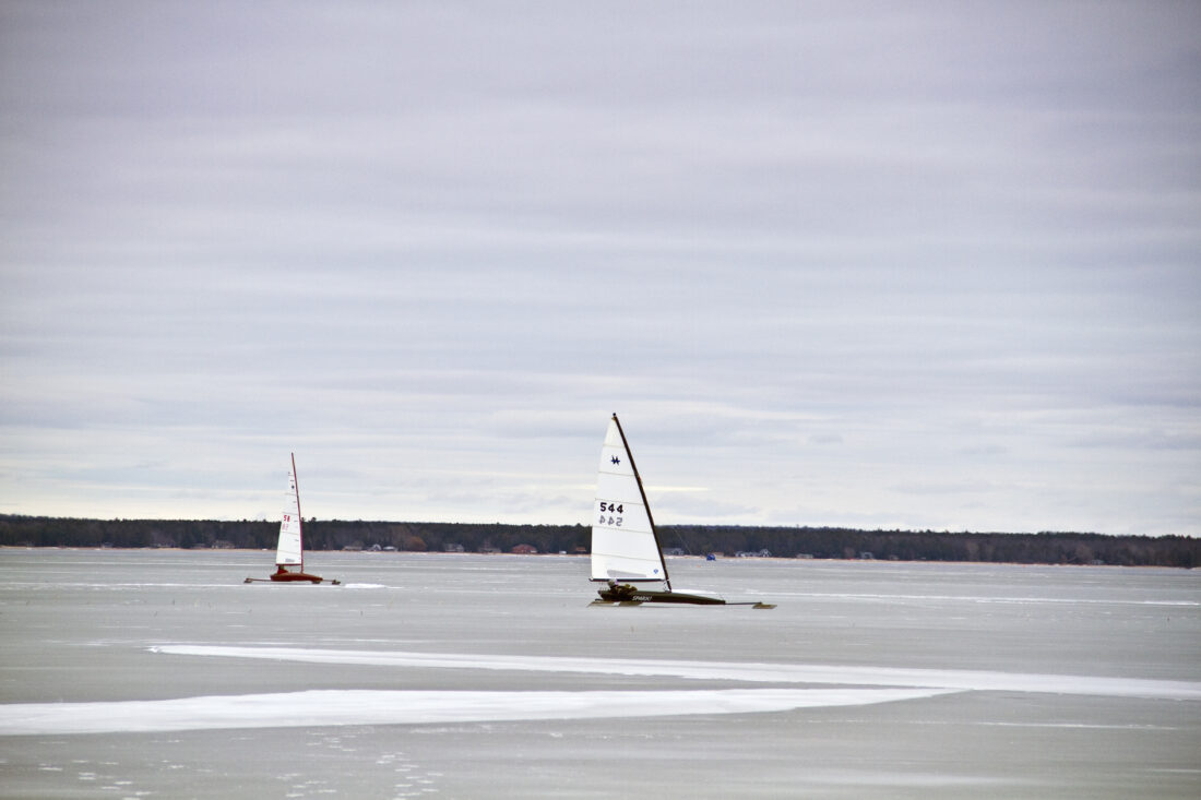 Ice sailboats glide over the frozen surface of Little Bay de Noc this past weekend. Lower temperatures may make more of this and other winter sports possible.