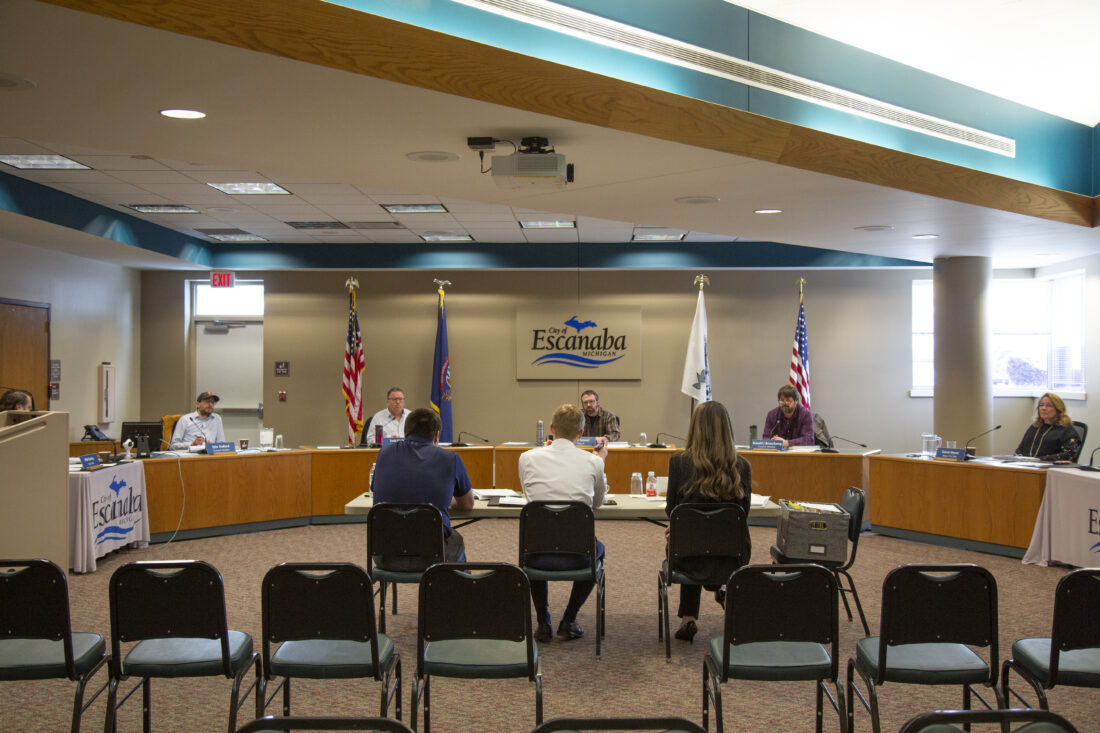 Ilsa Minor | Daily Press Escanaba City Council members, from left, Tyler DuBord, Todd Flath, Mark Ammel, Ron Beauchamp, and Karen Moore listen intently as Escanaba Department of Public Works Director Kent DuBord, City Manager Jim McNeil, and Controller Melissa Becotte speak about the needs of the public works department during the city’s first day of budget hearings Monday.