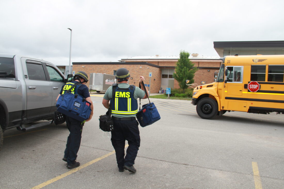 Emergency medical personnel arrive at an active shooter drill that took place Wednesday at an Escanaba school, while a school bus waits to transport evacuees to a reunification site. The junior/senior high school was the second school in the county to host such an event, which aims to prepare first responders and schools for real emergencies, test the effectiveness of planned procedures and improve partnerships. Escanaba Public Safety, Michigan State Police, Delta County Sheriff and Central Dispatch were among the parties involved in the mock emergency. A similar drill took place in Gladstone last August and more will be set at other locations in the future.