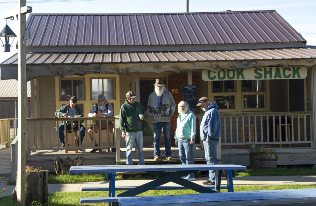 - Visitors to the Steam and Gas Engine show this weekend pause outside the Antique Village’s Cook Shack.