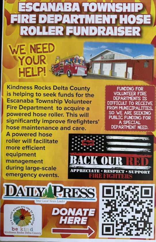 ESCANABA – Kindness Rocks Delta County has set a $7,000 fundraising goal to help the Escanaba Township Fire Department acquire a powered hose roller.
