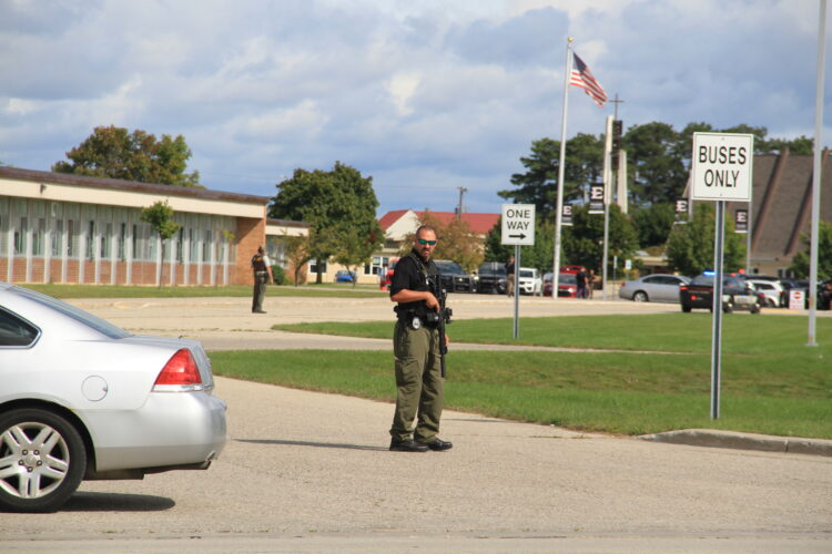 IMGL8703 Officers form a perimeter at entrances to Escanaba Junior/Senior High School parking lots yesterday. NewsletterToday's breaking news and more in your inboxEmail(Required) I'm interested in (please check all that apply)(Required) Daily Newsletter Breaking News Obituaries Are you a paying subscriber to the newspaper?(Required) Yes No
