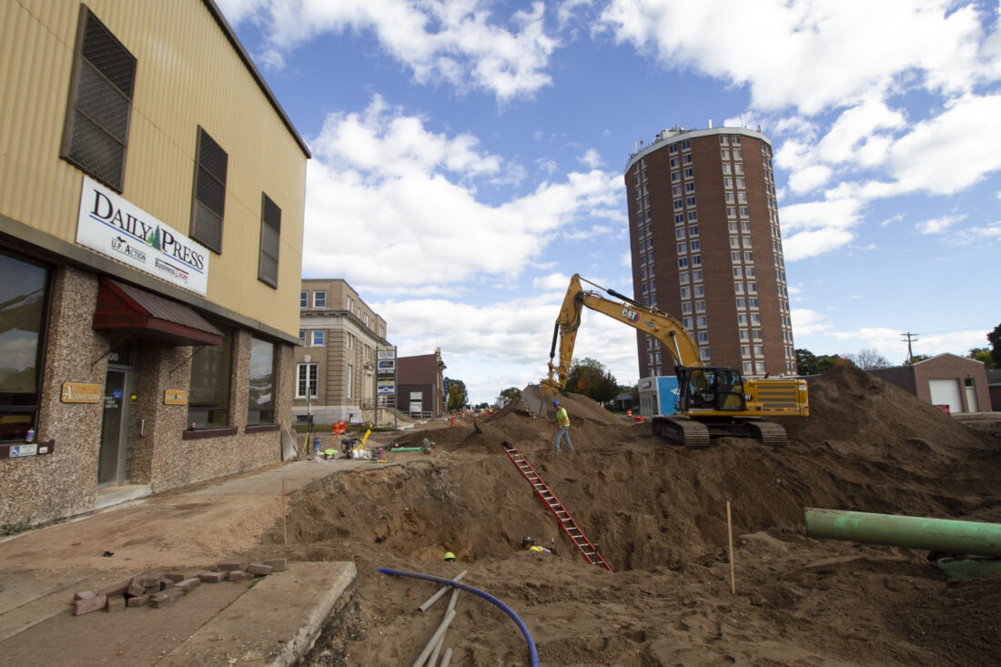 Contractors work Wednesday beneath Ludington Street in front of the Daily Press building as part of the City of Escanaba's ongoing infrastructure improvements. Beyond stands Harbor Tower. (R. R. Branstrom | Daily Press)