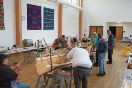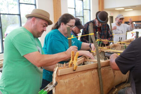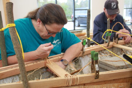“It was a great experience for people who’ve never seen one made before,” said Gladstone resident Larry Godfrey, who assisted with the build. Godfrey has built his own birch bark canoe in the past — and he learned from Paquin.