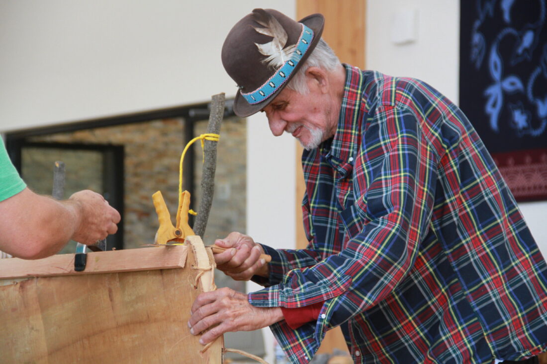 While actual construction in the community center only took a few days, the process of gathering all the materials is the longer part. Spruce tree roots are used to stitch the pieces together. Hardwood — oak — becomes the thwart, the crosspiece that braces the sides of the canoe. Cedar planks form the gunnels. Some pieces, like the spruce roots used to tie and cedar strips that bend around the top rim of the hull, need to be soaked in water to remain pliable. Similarly, the birch cannot be too dry or it becomes brittle. Not all birch bark is suitable; pieces must be thick.