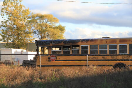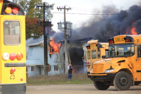 Neighboring the Race Ramps site to the south is the Escanaba Area Schools bus depot. Although Gene’s Towing was called to get buses out of harm’s way and some were moved, the fire still leapt and damaged a couple of school vehicles.