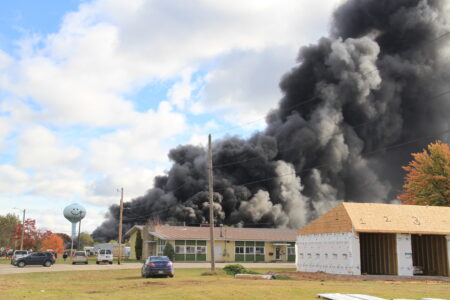 As heavy, dark smoke poured southeast from the building, obscuring roadways and the sky in some areas, an “extreme” emergency alert was issued at 1:12 p.m. As the smoke was potentially carrying hazardous particles, people in its path were told to shut down air handling systems, close windows and other openings and avoid smoke exposure.