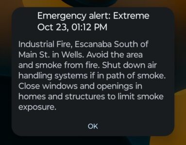 - Emergency alerts were issued to devices in the area of an industrial site fire Thursday in Escanaba.
