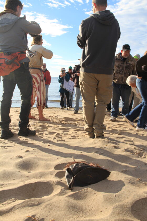 - Peter Frank’s iconic homemade, tricorne deerskin hat sits in the sand as Frank greets family and friends on the beach in Escanaba after 479 days doing the Great Loop in a canoe. (R. R. Branstrom | Daily Press)