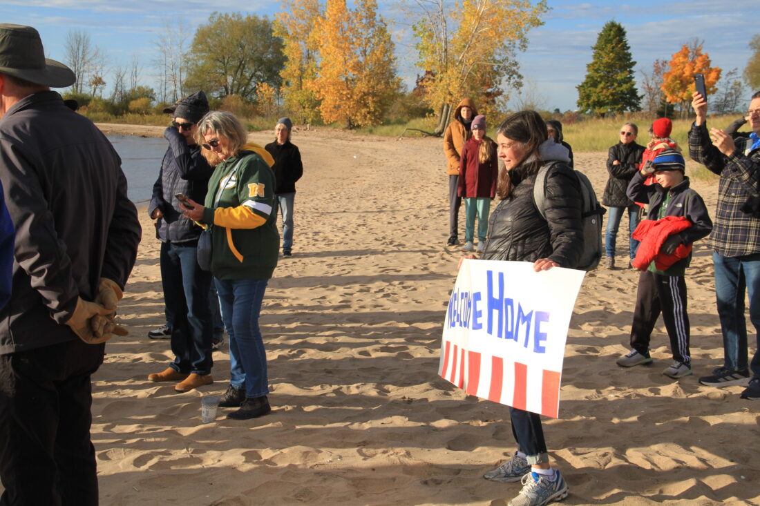 - One of many on the Escanaba Municipal Beach to welcome home the Great Loop canoeist, Kathy Kohtola of Gladstone holds a “Welcome Home” sign.