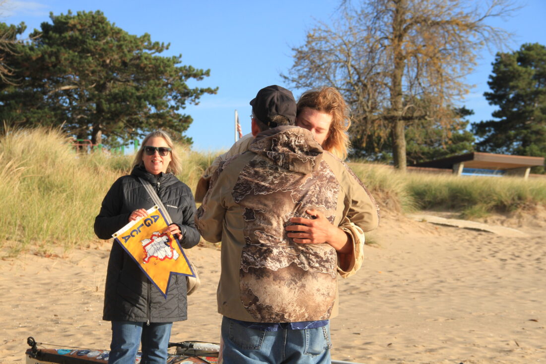 Despite that statement, he stayed on the beach speaking to the crowd, both at large and one-on-one, for about an hour. There were people from near and far who had followed his journey online and had brought signs, family members who were lifted into the air when Peter hugged them, cameras wielded by individuals and news crews.