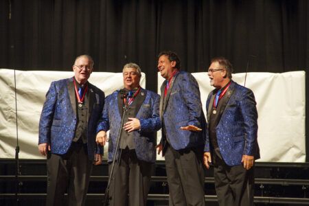 Vintage Blend, from the Pioneer District Barbershoppers in Lower Michigan, were one of the groups of musicians hosted by The Remnants at the Harvest of Harmony concert on Saturday. Its members are, from left, tenor Mark Wilson, lead Jamie Carey, baritone Kirk Wood and bass James Masalskis. (R. R. Branstrom | Daily Press)