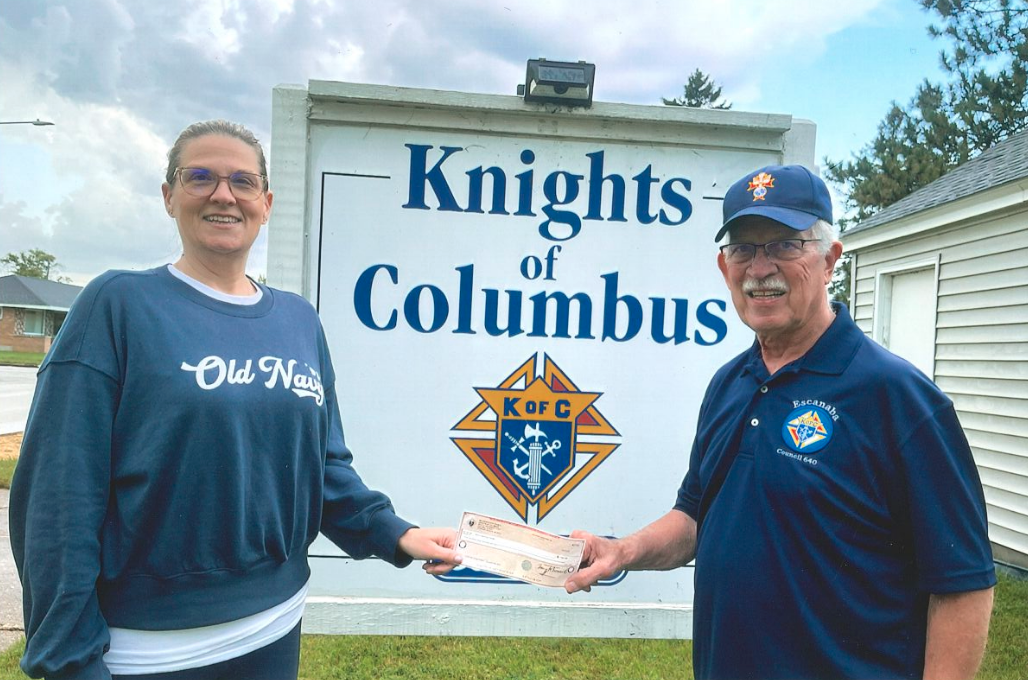 The Knights of Columbus Council 640 of Escanaba recently distributed funds from its annual Tootsie Roll Drive. Several organizations were presented checks for $561.58, including Bay Cliff Health Camp, the Escanaba Rotary Club 2642 for Camp Harstadt Trust, Bridgewood Central and Ray of Sunshine. Here, Cheryl Peterson, left, of Adult Learning Systems receives a check from Allan Blahnik of Knights of Columbus. (Courtesy photo)