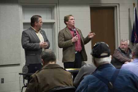 - State Rep. Dave Prestin, left, and state Sen. Ed McBroom, right, stand before citizens during a town hall in December 2023. Prestin announced Wednesday he will seek to succeed McBroom in the Michigan state Senate when McBroom leaves due to term limits at the end of 2026. (Daily Press file photo)