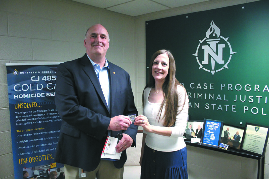 - Northern Michigan University cold case course instructor Christopher MacMaster hands a Michigan State Police challenge coin to Holly Letson, granddaughter of Helen Dymond; the subject of the current cold case program. Letson was able to meet with students last week to share context and familial connections to students working on her grandmother’s cold case. (Antonio Anderson | Mining Journal)