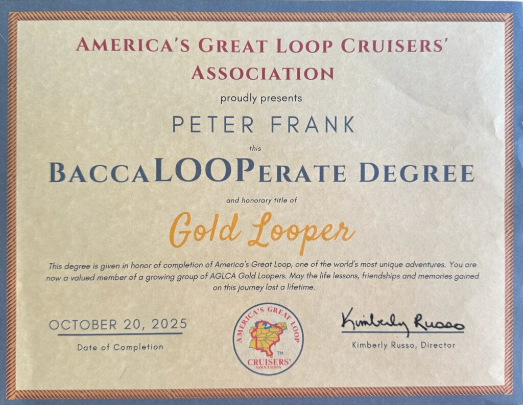 Many boaters rely on the AGLCA to provide them with information and assistance that contributes to the successful completion of their journey. Frank is a member, and now that he has completed one loop, his fresh degree signed by AGLCA Director Kimberly Russo grants him the honorary title of “Gold Looper.” People who have completed the loop multiple times become “Platinum Loopers.”