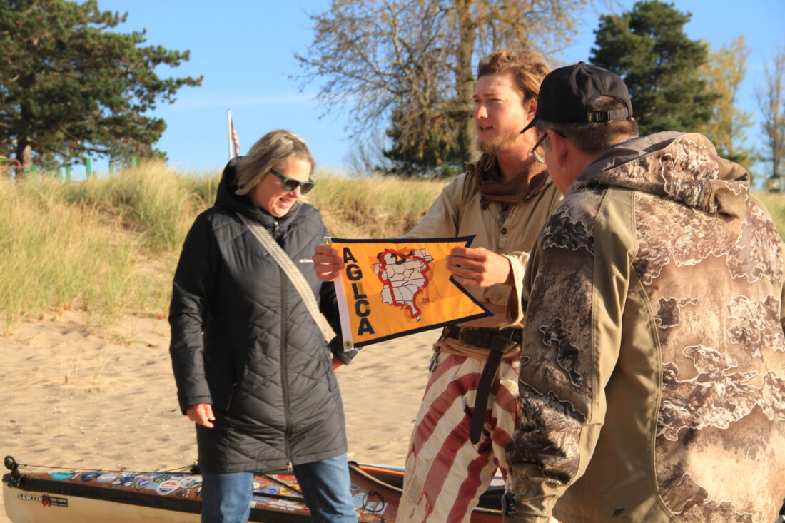 - 24-year-old Peter Frank holds up a fresh burgee of the America’s Great Loop Cruisers’ Association moments after finishing the loop himself and being greeted on the beach in Escanaba by his parents Ellen and Butch, shown, and many others. (R. R. Branstrom | Daily Press)