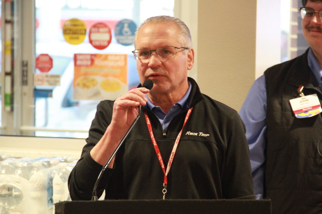 On the first day of business at the new convenience store and gas station in Escanaba, Kwik Trip CEO Scott Zietlow speaks to staff, community representatives and customers. Wednesday's ceremony included a ribbon-cutting, words from company coworkers, the presentation of $1,000 donations from Kwik Trip to Escanaba Public Safety and the Escanaba Township Volunteer Fire Department, and a framed "first dollar" from the Delta County Chamber of Commerce to the business. (R. R. Branstrom | Daily Press)