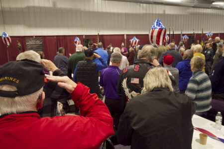 - Veterans salute during last year’s Veterans Day ceremony at the Delta Chamber of Commerce on Nov. 11, 2024. (R. R. Branstrom | Daily Press file photo)
