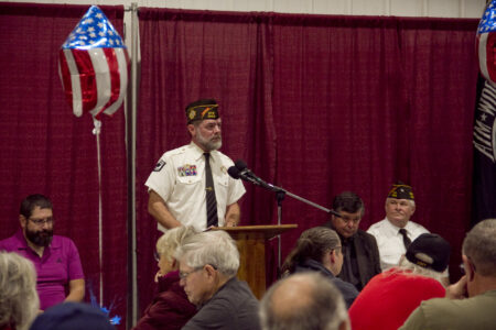 - Steve Kwarciany, an Air Force veteran and commander of the Delta County Veterans Council, speaks during last year’s Veterans Day ceremony at the Delta Chamber of Commerce. (Daily Press file photo)